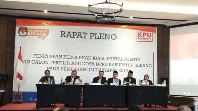 lBC, Serang - Komisi Pemilihan Umum (KPU) menggelar Rapat Pleno Penetapan perolehan kursi parpol dan calon terpilih Anggota DPRD Kabupaten Serang pada Pemilihan Umum 2019 di salah satu hotel di Kecamatan Waringin Kurung pada Sabtu, 10 Agustus 2019. Calon terpilih dari Partai Kebangkitan Bangsa (PKB) daerah pemilihan (dapil) satu, Abdul Gofur dibatalkan digantikan oleh Abdul Kholik.
