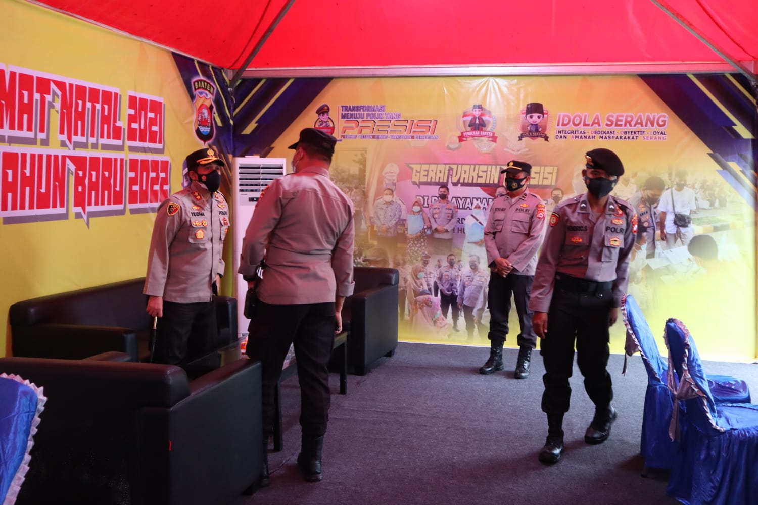 lBC, Serang - Untuk memastikan kesiapan anggota dalam melaksanakan tugas pengamanan dan pelayanan libur Natal dan Tahun Baru, Kapolres Serang Yudha Satria mengunjungi Pos Pelayanan Terpadu dan Pos Pengamanan di gerbang Tol Ciujung Kragilan dan Pos Pelayanan di Kawasan Modern Cikande, Jumat 24 Desember 2021.