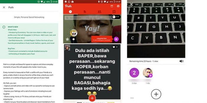 lB, Serang--“Foto dan video 24 jam” ala Snapchat rupanya sedang mewabah di kalangan pengelola media sosial. Setelah WhatsApp, Facebook, dan Instagram, kini giliran Path menerapkan fitur serupa.