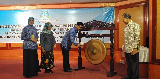 lBC, Serang - Kementerian Pemberdayaan Perempuan dan Perlindungan Anak (Kemen PPPA) Republik Indonesia menggelar kegiatan peningkatan kapasitas aparat hukum dalam perlindungan dan penanganan anak yang berhadapan dengan hukum bertempat di Le Dian Hotel, Kota Serang pada Selasa, 22 Mei 2018. Acara yang di ikuti aparat penegak hukum baik dari unsur kepolisian, kejaksaan dan pengadilan dari empat daerah di Indonesia yakni Provinsi Banten, Sumatera Selatan, Lampung dan Bengkulu tersebut, dibuka secara resmi oleh Sekretaris Daerah (Sekda) Provinsi Banten, Ranta Soeharta.
