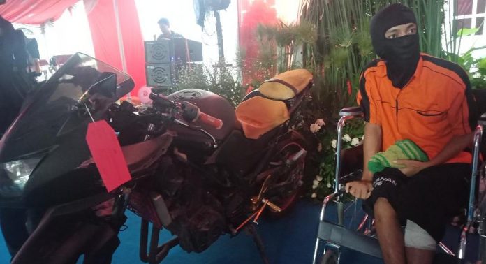“Korban sedang naik motor lalu tersangka menghampiri korban dan menjambret tas korban, sehingga membuat korban terjatuh dari motor dan menyebabkan korban luka berat,” jelas Kapolres.
