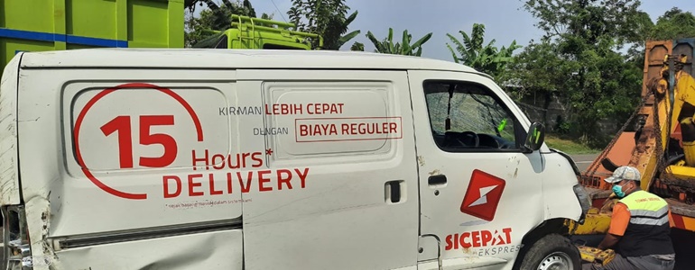 Kendaraan perusahaan ekspedisi 15 Hours Delivery yang dikemudikan warga Sumur Pancing, Kariwaci, Tangerang Selatan ini sebelumnya mengalami pecah ban. Tidak ada korban jiwa dalam kecelakaan tunggal ini namun pengemudi dilarikan ke rumah sakit setempat karena menderita luka-luka.