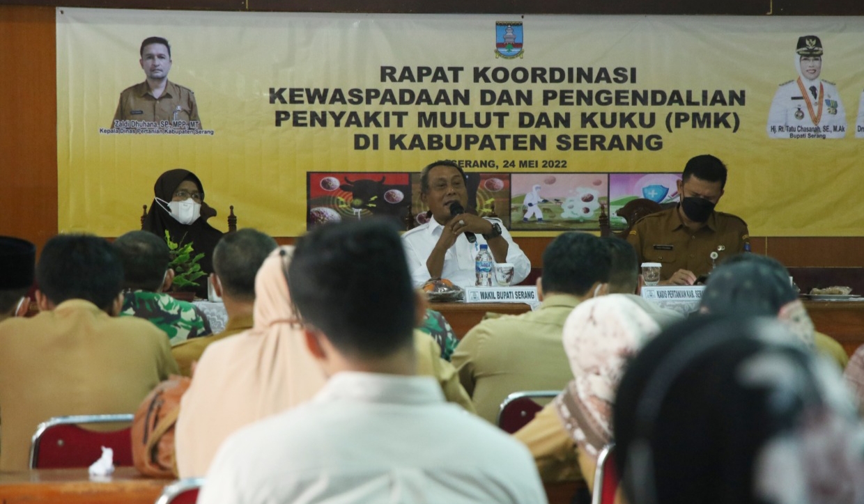 Hal itu disampaikan Kepala Dinas Pertanian (Distan) Kabupaten Serang Zaldi Dhuhana usai Rapat Koordinasi Kewaspadaan dan Pengendalian PMK di Kabupaten Serang di Aula Tubagus Suwandi pada Selasa, 24 Mei 2022. Turut hadir Wakil Bupati Serang Pandji Tirtayasa para kepala organisasi perangkat daerah (OPD) terkait, para camat dan unsur TNI dan Polri.