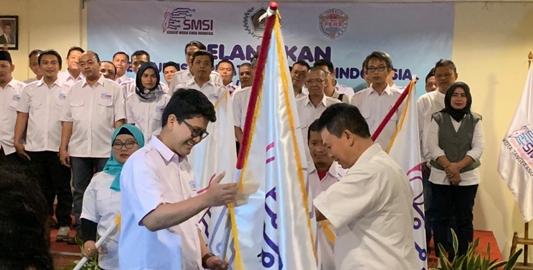 lBC, Tangerang - Pengurus Serikat Media Siber Indonesia (SMSI) Kota Tangerang Selatan, Kota Tangerang, Kabupaten Tangerang (Tangerang Raya) periode 2019-2022 resmi dilantik oleh Ketua SMSI Banten, Edi Junaidi di Horison Grand Serpong, Jalan M. H. Thamrin KM 2.7, Panunggangan Utara, Kebon Nanas, Tangerang pada Sabtu, 25 Mei 2019.