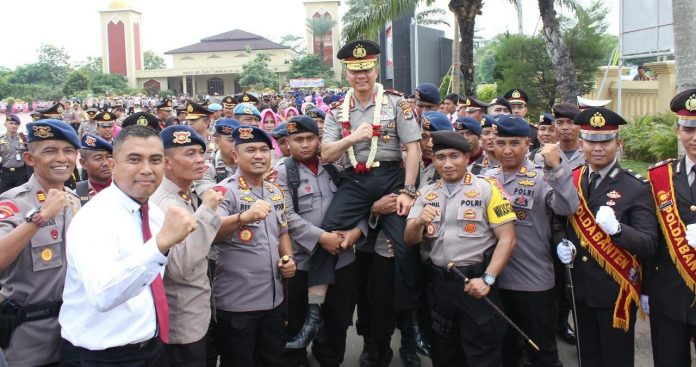 lBC, Serang – Kepolisian Daerah (Polda) Banten menggelar upacara Farewell and Come (perpisahan dan datang) parade dari Brigjen Teddy Minahasa kepada Brigjen Tomsi Tohir di halaman Mapolda Banten, Kota Serang pada Selasa, 27 November 2018. Brigjen Teddy Minahasa mengatakan, selama seratus hari mengemban amanah sebagai Kapolda Banten dirinya mengucapkan rasa terimakasih atas kerjasama dan dukungannya dari seluruh jajaran Polda Banten.