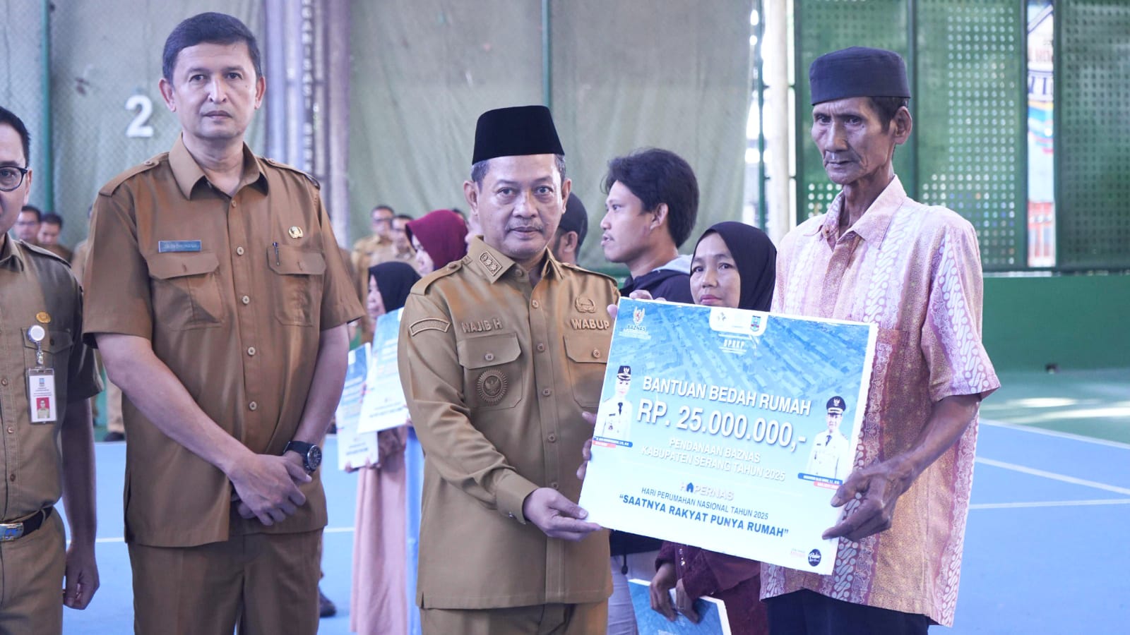 lBC, Serang - Wakil Bupati (Wabup) Serang Muhammad Najib Hamas menyerahkan secara simbolis bantuan 497 unit rumah tidak layak huni (RTLH) di Lapangan Tenis Indoor pada Senin, 1 September 2025. Penyerahan dilakukan usai Wabup Najib Hamas menjadi Inspektur Upacara Peringatan Hari Perumahan Nasional (Hapernas) ke 17 Tahun 2025.