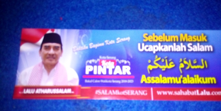 “Baktiku Bagimu Kota Serang, Sebelum Masuk Ucapkanlah Salam, Assalamualikum,” tulis stiker yang dilengkapi dengan foto Lalu Atharussalam dan nama Relawan.