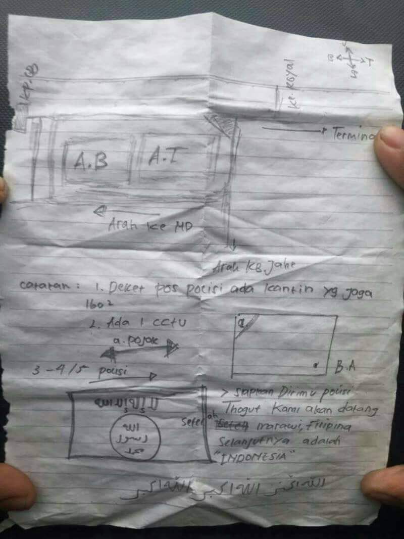 Dalam kertas itu juga ada kalimat "Siapkan dirimu Polisi Thogut kami akan datang setelah Marawai, Filipina selanjutnya adalah Indonesia".