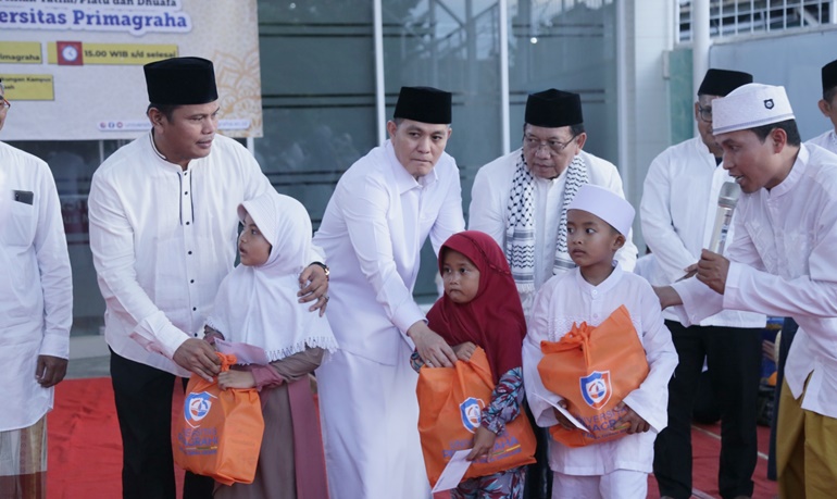 lBC, Serang - Universitas Primagraha (UPG) menyantuni anak yatim dan membagikan ratusan sembako kepada warga di momentum Buka Puasa Bersama Civitas Akademi UPG di Lapangan Parkir Universitas Primagraha Cimanggung, Kota Serang.