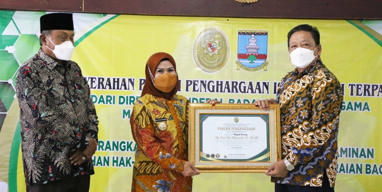 lBC, Serang - Bupati Serang Ratu Tatu Chasanah meraih penghargaan dari Direktorat Jendral (Ditjen) Badan Peradilan Agama (Badilag) Mahkamah Agung (MA) Republik Indonesia. Penghargaan di serahkan oleh Direktur Jendral (Dirjen) Badilag Aco Nur di Aula Tubagus Suwandi Setda Kabupaten Serang pada Kamis, 7 April 2022.
