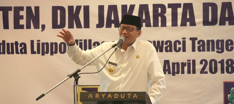 lBC, Serang - Gubernur Banten, Wahidin Halim menghadiri acara Forum Konsolidasi Pengendalian Pemanfaatan Ruang Daerah Lintas perbatasan wilayah Banten, DKI Jakarta dan Jawa Barat (Jabar). Acara berlangsung di Aryaduta Lippo Village Karawaci, Tangerang pada Kamis, 19 April 2018.