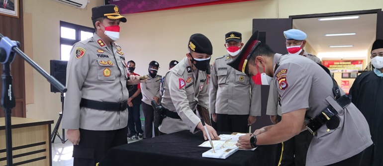 lBC, Serang - Kapolres Serang AKBP Yudha Satria memimpin serah terima jabatan (sertijab) Kepala Satuan Lalulintas (Kasatlantas) dan Kapolsek Kopo di Aula Mapolres Serang pada Jum'at, 27 Agustus 2021.