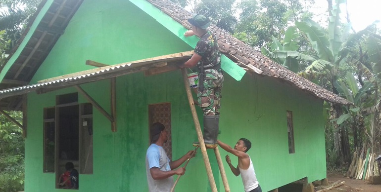 Dilain tempat, terlihat anggota TNI gabungan dibantu Polri dan masyarakat sedang mengerjakan perehaban rumah milik, Amah (75 tahun) di Kampung Citeureup, Desa Cimanyangray.