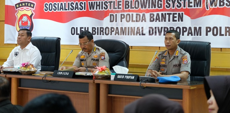 lBC, Serang - Divisi Propam (Divpropam) Polri melaksanakan Sosialisasi Whistle Blowing System (WBS) Online di Rupatama Mapolda Banten pada Kamis, 15 Agustus 2019. Kegiatan sosialisasi tersebut dibuka oleh Irwasda Polda Banten Kombes Pol I Nyoman L. Suradnya didampingi Kabag Binpam Biro Paminal Divpropam Polri Kombes Pol Eldy Yudianto, Kabdipropam Polda Banten Kombes Pol Yulianus Yulianto.