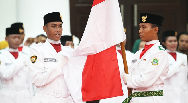 lBC, Serang – Anggota Pasukan Pengibar Bendera Pusaka (Paskibraka) Banten dikukuhan oleh Gubernur Banten, Wahidin Halim di Pendopo Gubernur, Kawasan Pusat Pemerintahan Provinsi Banten (KP3B), Curug, Kota Serang pada Rabu, 15 Agustus 2018. Gubernur menyampaikan bahwa Paskibraka Provinsi Banten adalah wujud Kebanggan serta pengabdian masyarakat Banten yang di wakili putra-putri terbaik Provinsi Banten untuk Republik Indonesia.