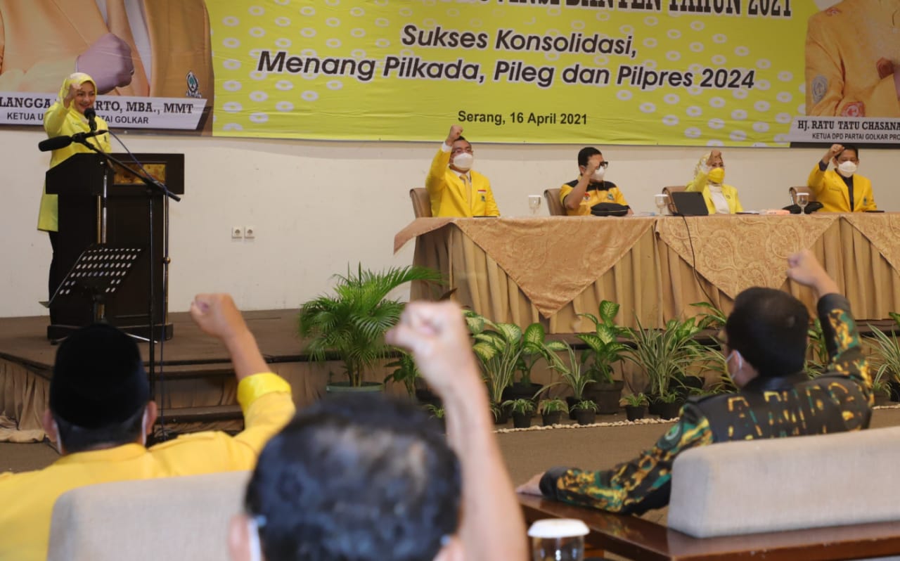 "Pak Airlangga sudah diminta oleh 34 DPD provinsi untuk maju pada pilpres. Kunci kemenangan tahap awal kita adalah konsolidasi dan sosialisasi. Untuk pilkada Banten dan kabupaten/kota, wajib kader Golkar maju,” tegas Tatu.