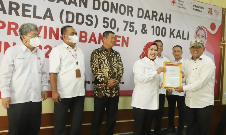 lBC, Serang - Palang Merah Indonesia (PMI) Provinsi Banten kembali memberikan penghargaan terhadap para pendonor darah sukarela 50 kali, 75 kali, dan 100 kali. Apresiasi ini diberikan langsung oleh Ketua PMI Provinsi Banten Ratu Tatu Chasanah di Markas PMI Banten, Kota Serang pada Rabu, 2 November 2022.