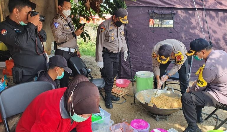 "Untuk juru masak, kami kerahkan personil polwan. Di sini kita memasak nasi goreng untuk dibagikan kepada masyarakat dan seluruh personel yang bertugas untuk pengamanan PSBB. Jadi bagi masyarakat jangan malu untuk datang dan makan bersama" kata Kapolres.