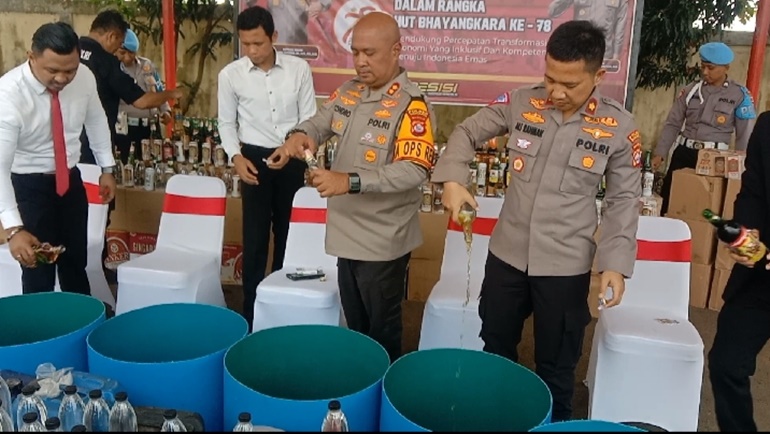 lBC, Serang - Dalam rangkaian peringatan Hari Bhayangkara ke-78, Polres Serang melakukan pemusnahan minuman keras (miras) sebanyak 5.061 botol di Mapolres Serang, Senin 1 Juli 2024.