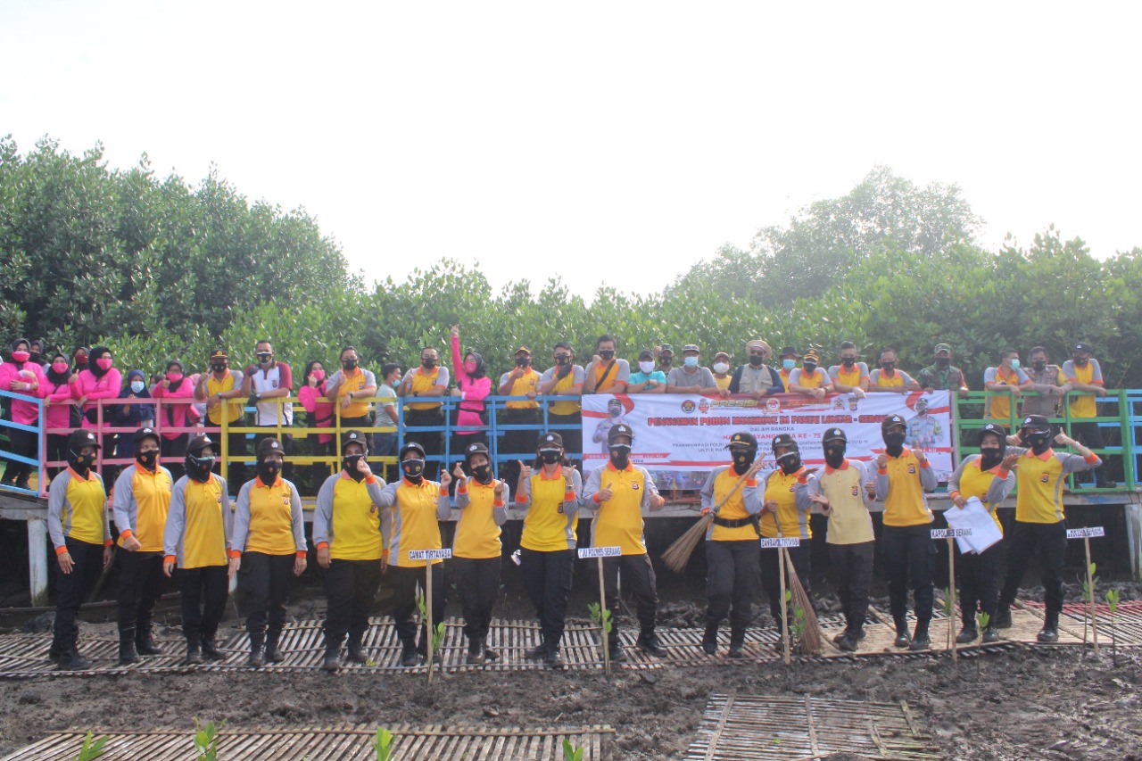 lBC, Serang - Kepolisian Resor (Polres) Serang yang dipimpin Kapolres AKBP Mariyono berserta polsek jajaran, Koramil serta Pengurus Bhayangkari Cabang Serang melakukan kegiatan bersih-bersih pantai dan penanaman pohon mangrove di Pantai Lontar, Kecamatan Tirtayasa, Kabupaten Serang pada Jum’at, 25 Juni 2021.